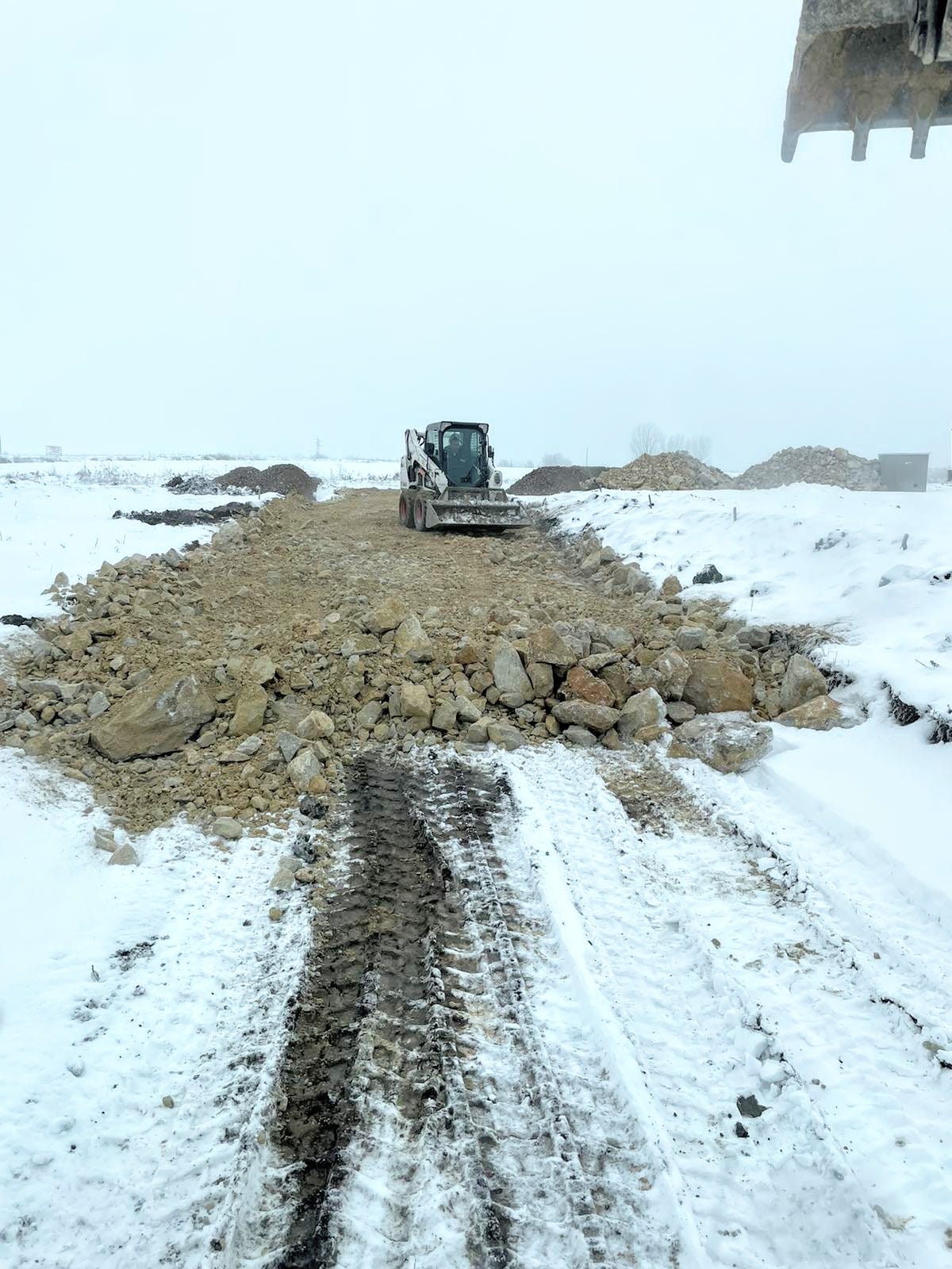 In early January, the contractor called that they finally have the machines available to fill the road bed with rocks - first large size pieces, then a bit smaller and a finer fraction of gravel at the top.